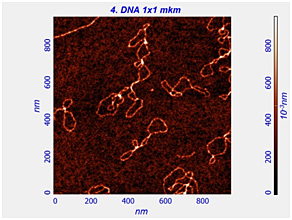 On cantilevers HA_ CNC probes obtain fairly stable resonance, so they can be used not only for supply but also for scanning in amplitude-modulation mode. For instance, with a HA CNC probe our engineer was able to obtain a good image of DNA chains in high resolution, which you can see below.