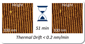 This guarantees the exceptionally low thermal drift of less than 0.2 nm/min. The cabinet also protects the positioned microscope from external acoustic and vibrational noises with passive and active means of damping.