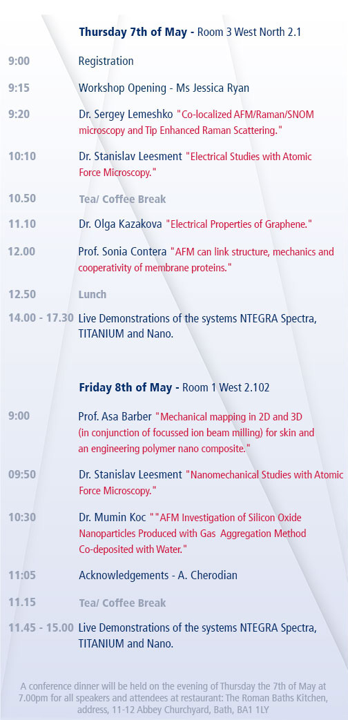 NT-MDT is excited to extend an exclusive invitation for you to participate in our Bath workshop at The University of Bath on Thursday the 7th and Friday the 8th of May focusing on the techniques of AFM, Raman, SNOM and TERS. The workshop will take place on the days following the University of Bath’s popular series of one-day imaging-related conference on Wednesday the 6th of May 2015. Please note separate registration is required for both events, those wishing to attend the meeting on the 6th should also contact u.j.potter@bath.ac.uk. In addition to the talks we will be able to provide and demonstrate measurements on the NTEGRA Spectra, and TITANIUM devices as well as introducing our new Thermal Chamber. We would also like to take the opportunity to invite you to join us for a conference dinner that will be held on the evening of Thursday the 7th May at 7.30pm for all speakers and attendees, venue is to be confirmed. NT-MDT WORKSHOP IS FREE OF CHARGE FOR ALL ATTENDEES. Please respond to Jessica Ryan ryan@ntmdt.ie to confirm your attendance. |