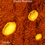 The general aspects of elastic modulus mapping in HybriD Mode were presented in our application note and, currently, we are preparing the detailed operation instructions that cover the following topics: a rational determination of the optical sensitivity, an optimized choice of the probe for testing materials with different elastic modulus; and the peculiarities of elastic modulus mapping at the nanometer scale. An example of high-resolution modulus mapping of a blend of polystyrene and low density polyethylene is given above. |