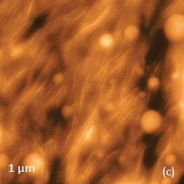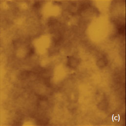 An example of the dynamic mechanical studies in the contact mode (the contact resonance technique), which were performed on a surface of high-density polyethylene partially covered with a flake of graphite, is presented in Figures 3a-c. In this contactresonance experiment a probe stays in the contact with a sample and the amplitude-versus-frequency spectrum of the probe, which is driven by a shaker, exhibits one or more contact resonances. As the probe scans over a sample surface the amplitude, phase or frequency of such resonances varies when the probe interacts with the locations of different stiffness. Basically the contact resonance shifts to higher frequency on stiffer locations. This effect is pronounced in the amplitude and phase images shown in Figures 3b-c. An edge of the graphite flake, which is recognized in the bottom part of the examined area (Figure 3a), shows the lower amplitude values and higher phase contrast as compared to the polymer in the top region. This is consistent with the fact that graphite (elastic modulus ~10 GPa) is stiffer component at this location. Furthermore, the phase image also exhibits the contrast variations on the polymer surface. This effect can be attributed to local variations of either stiffness or adhesion and it demonstrates a higher sensitivity of the phase response. A continuing interest to the contact resonance studies is also related with a possibility to explore the sample viscoelastic behavior [9] and thus to enhance the characterization of local mechanical properties of materials.