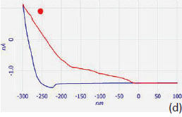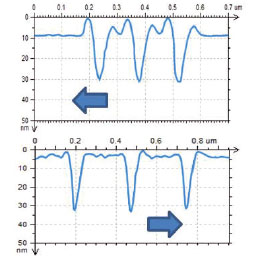 The contrast is difficult to interpret because of an additional complication related to the fact that a rigid substrate might influence the local thicknessof such 70-nm thick film. A comparison of the indents appearance and the cross-sections, which are presented in Figure 10c, points out that the matrix material is more plastic whereas the PVAC indents are smaller most likely due to their faster recovery. Another example is taken from studies of HDPE sample, whose surface exhibits developed lamellar structures with the individual lamellae being flat or edge-on oriented, Figure 11d. Several indents were made on flat-lying lamellae, and the remaining indents of 6-7 nm in depth are shown in Figure 11e. These values are close to the thickness of individual lamellae that was most likely penetrated by the tip. The loading and unloading traces recorded during the indenting of the lamellae (Figure 11f) are rather complicated. At the beginning of the loading path, which is indicated with a blue arrow, the deformation is elastic and it transforms into a small plastic part before climbing further. The initial deformation is quite similar to one that was reported in the indenting of the flat lamellae of the ultra-long alkane C390H782 [21]. The unloading portion looks more typical for deformation of semicrystalline polymers. The estimates of the elastic modulus for the loading and unloading paths in the regions indicated with the arrows showed that the elastic modulus of the initial deformation at least 50% higher. This can be expected because the polymer chains are oriented vertically in the flatlying lamellae and exhibit higher modulus compared to the bulk material with random orientation of polymer molecules. This example demonstrates the unique ability of AFM in studies of mechanical properties of the confined nanostructures.
