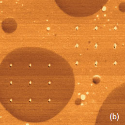The comparison of the indents made in different polymers shows that we can learn much about local mechanical properties of polymers in addition to the measurements of elastic modulus and adhesion. This statement is further s upported b y the indenting results, which were obtained a surface of an ultrathin film of a binary blend of PS and poly(vinyl acetate) - PVAC, Figures11a-b, and on lamellar structure of high-density polyethylene (HDPE), Figures 11c-d. Two grids of 9 indents are seen on the round-shape domain of PVAC and surrounding matrix of PS. Although, at room temperature these components are in glassy state and elastic modulus of PS is slightly larger than that of PVAC the phase image shows a darker contrast on the PVAC domains.