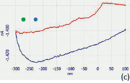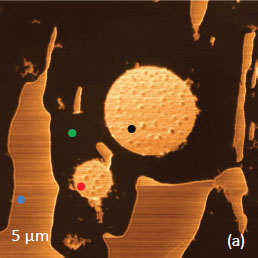 The variety of 2D and 3D morphologies of polymer materials is enormous and some of them are nontrivial for characterization. Even in binary blends their constituents can appear in structures of different size and shape as shown in phase image of PS/PB blend, Figure 12a. As we learned earlier (see the description of Figures 5), the bright domains of the phase image can be assigned to PS structures embedded into PB matrix. Several locations, which are marked with small circles of different colors, were chosen for the indentation experiments, and the phase image obtained after the experiments is presented in Figure 12b. Surprisingly, the DvZ curves obtained at the “blue” and “green” locations, which are assigned to PS and PB materials, are the same, Figure 12c. The loading and unloading paths show mostly strong adhesion.