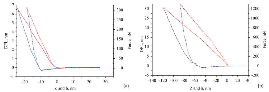 The phase image in Figure 12b, which shows a circle of PB at the former “blue” location, allows us to suggest that the PS domain was quite thin and was destroyed by the tip, which was attracted to the sample because of its relatively large size. The DvZ curves, which were obtained at small and large round-shaped islands of PS, have different shapes, Figures 12d-e. The curve obtained on the small island has two stages (Figure 12d) and this might correlate with a partial damage of the island as seen from the phase image in Figure 12b. The curve, which was collected on the black-colored location of the big island, looks common to those collected on the blocks of PS and other amorphous polymers. This example of the sample complexity shows that a comprehensive study of multicomponent materials can be quite difficult and likely requires the interplay between different methods and approaches.