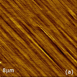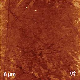 The repetitive scanning of this area helps cleaning the sample surface, which exhibits a number of polishing lines, Figure 3c. Remarkably, the VPFM phase contrast, which reveals the domain morphology of the sample, is much cleaner on the areas free from the adsorbate, Figures 3c-d. Actually, in studies with the probe, which is 240 micron in length and has spring constant around 2 N/m, the piezo-response in the phase images was most noticeable with the operation at the contact resonance near 364 kHz. More peculiarities of the PFM measurements will be mentioned in the analysis of the data obtained on different samples.
