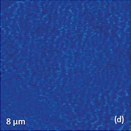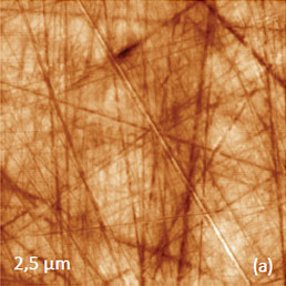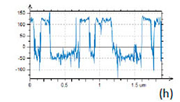 An application of PZT material for ferroelectric random access memories, which is justified by material large polarization and relatively reliable integration process, requires the improvement of the PZT fatigue and retention performance. The retention behavior is related to oxygen and Pb vacancies, and it can be improved by doping the material with lanthanum, niobium or other additives. A small addition (up to 10%) of donor dopant, like La3+ ions, enhance domain wall mobility leading to improved remnant polarization and also to lower dielectric constant and Curie point [12]. Characterization of PLZT material can be improved by PFM studies. As it was discussed above, a removal of a top contamination layer by a scanning probe opens a flat topography of the PLZT ceramic sample with a composition (Pb0.905La0.095 (Zr0.65Ti0.35)0.9575O3). The large-scale images (not shown here) show that the sample is composed of the grains of irregular hexagonal shape, which are typical for dense packing in hot-pressed ceramics. The largest grains have up to 10 microns in dimensions and a part of one of the grains is presented in Figures 7a-c. The height image of the sample reveals multiple polishing scratches (Figure 7a) whereas the domain morphology is clear distinguished in the VPFM amplitude and phase images (Figures 7b-c). Light and dark areas correspond to elongated wavy domains with opposite signs of the vertical polarization. This is evidenced by the 180-degrees steps seen in the phase profile in Figure 7d. The cross-section profile, which is made in the VPFM amplitude image, shows the depressed traces that represent the domain walls. These features are around 50 nm in width and they have a curved shape that is known as the domain roughness originated from the pinning of the domain walls by randomly distributed immobile defects. Domain walls should be flat in the absence of irregularities pinning the wall motion.