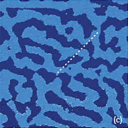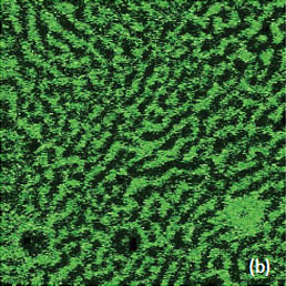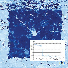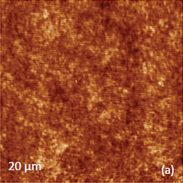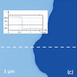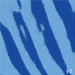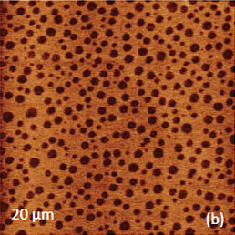 This work and the latter publication [18] presented a variety of TGS domain morphologies examined at different temperatures. These studies were performed with the probe scanned the sample in the contact mode with electric bias of 5 V at 40 kHz. The observation of the positively and negatively polarized domains, whose morphology does not affected by topographic features, was explained by detecting the electrostatic force variations caused by the surface charge density. This explanation is the alternative to the piezo-response effect. We have examined a single crystal of TGS of few millimeters in thickness. The crystal was cleaved to reveal a fresh surface (a-c plane). The height image of the surface reveals multiple patches with a depression slightly above 1 nm in depth, Figure 12a.