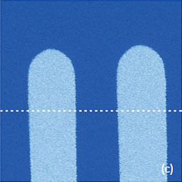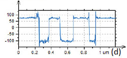 A similar specimen with parallel polarized domains is distributed by NT‑MDT SI as the standard for PFM training and applications. The height and PFM images of PPLN standard are shown in Figures 10a-c. A polished surface of this sample is very smooth and has no traces of the domain morphology, Figure 10a. The VPFM amplitude image reveals the domain pattern with two bright 5-μm wide “fingers”, Figure 10b. The image contrast reflects the minimal amplitude variations in the fingers and the matrix but well distinguished domain walls. The cross-section amplitude trace in Figure 10d indicates that the depressions representing the domain walls have a sub- 100 nm width. The pronounced phase contrast of ~180 degrees in Figure 10c points on the opposite polarization of the fingers and their surroundings.