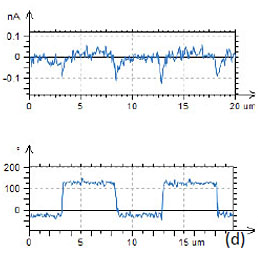 Figure 10. Height and PFM images of PPLN standard sample with the conducting probe with spring constant of 40 N/m. In the height image in (a) the surface corrugations are in the 0‑2.2 nm range. The amplitude variations in (b) are in the 0-0.25 nA range. The phase variations in (c) are in the 0‑350 degrees range. The crosssection amplitude and phase profiles across the polarized structure are shown in (d). The measurements were performed with the electric excitation 10 V at 30 kHz applied to the conducting probe with spring constant of 40 N/m