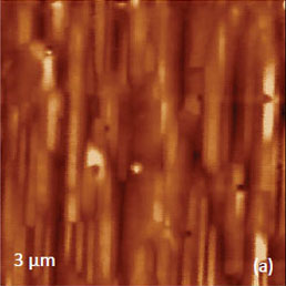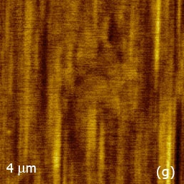 The situation changed after the crystal was heated to temperature above the material Curie point (49°C) and then cooled back to room temperature. As the height image of the annealed sample did not show changes (Figure 12c), the 180 degrees steps differentiate the domains of the opposite polarity appeared in the VPFM phase image, Figure 12d. The extended bright strips represent the parts of extended finger-like domains extended along the crystallographic a axis. The height and VPFM phase images of the larger area with 15-nm and 10-nm steps (Figures 12e-f) confirm that the domain morphology is practically independent from the surface topography. The slight traces of the topography cross-talk to the phase image are noticed only at the surface steps.