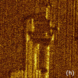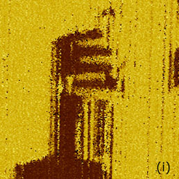 This material is used for different actuators and PZT films serve as capacitors and data storage elements. Studies of PZT with scanning force microscopy were initiated almost 20 years ago [10]. We have performed PFM imaging of a PZT film, which is 4mm thick, using the conducting probes with spring constants of 2 N/m and 40 N/m. The earlier study of this film showed that is has a columnar structure with random orientation of the grains with sub-micron lateral dimensions [8]. The height and PFM images of this sample obtained with the softer probe, Figures 4a-4c, reveal it grainy topography and the unique contrast of the VPFM phase image with the domains of opposite contrast. The cross-section taken along the several domains demonstrates that they differ by 180 degrees, Figure 4d. The contrast of the PFM amplitude image is quite dissimilar to the phase image and because it has a strong contribution of the sample topography. This effect is not unusual for the operation at the contact resonance in which topography variations are amplified as well as the sample piezo-response. A comparison of the topography image with the amplitude and phase maps for the PFM operation at the sub-resonant frequency with the stiff probe shows that the latter reflect the intrinsic domain structure of the sample that is not related to the surface topography, Figures 4e-f. The cross-section of a part of the phase image in Figure 4h reveals that the contrast reflects the reverse polarization of the domains. There are a large number of small domains with the diameter in the 50-100 nm range and some of them having opposite polarization.