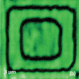 This information is instructive when one wants to polarize the sample. One of the areas of PZT film was polarized by scanning the probe with DC bias voltage of 20 V, Figures 6a-b. The effect of polarization, its magnitude, and possible dissipation can be monitored in the PFM mode. The PFM imaging of a slightly larger area revealed that the polarized region exhibits a much stronger response compared to its non-polarized surrounding. This effect can be reversed by scanning the polarized area with the probe having negative bias voltage of -20 V. Such switching of the polarization was achieved in the top part of the polarized area as seen from Figures 6c-d.