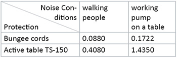 The latter were caused either by human traffic near the cabinet or by operating a vacuum pump, which was placed at the same table as the cabinet. The deflection measurements were performed for the microscope placed on the bungee cords’ support and on the active vibration protection tablet TS-150 in “off” and “on” conditions. The comparative deflection signal values, which were obtained in these experiments, are shown in Table 1.