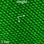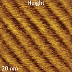 These dC/dZ images were recorded with the scanning rate in the 1-2 Hz range that allows precise recording of the surface corrugations reflecting atomic and molecular arrangement in these samples. The practically immobile positions of donut-shaped and ribbon-like self-assemblies of semifluorinated alkane (Figure 4) underline low thermal drift of the microscope.