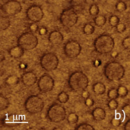 The height image of PS/PVAC film on the ITO substrate shows the morphology in which the circular domains of different height are embedded into a relatively flat matrix. Only small contrast changes are noticed on the domains and matrix locations whereas the domains’ edges are seen most pronounced.