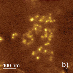 A number of bright nanoparticles seen in a central part of the height image can be assigned to carbon black fillers. The suggestion is strongly supported by the IR reflection image in which the carbon nanoparticles show extremely bright contrast compared to the polymer matrix.