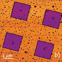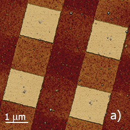 Another example is a grating in which the square-shaped SiO2 pads with lateral dimensions 1.5x1.5 µm and height of ~20 nm are grown on Si surface. The square blocks are well distinguished in IR images by a darker contrast compared to the Si substrate. This contrast reflects the differences between the real components (ε΄) of dielectric permittivity of these materials at 10.6 μm wavelength. The darker contrast of SiO2 pads in s‑SNOM map is consistent with lower value of its permittivity (εr=3.9) compared to that of Si (εr=11.7).