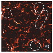 Phase and magnitude of cantilever oscillation recorded during scanning provide complementary information to AFM topography. Phase imaging shows a clear contrast once there is a detectable variation of interaction forces between cantilever and surface. Thus, phase images highlight grain edges and are not affected by large-scale height differences providing clearer observation of the sample fine features (Fig. 3c-d). Magnitude (cantilever oscillation amplitude signal) provide additional contrast (Fig. 3e‑f):