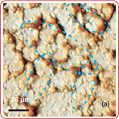 Optical images give complementary information to the AFM measurements. There is not complete correlation between the optical and AFM images (Fig. 3). Optical images of the cathode are formed by reflected light that is sensitive to the nature of the interface and grain reflection properties. The amount of light reflected back to the video CCD depends on crystal surface orientation.