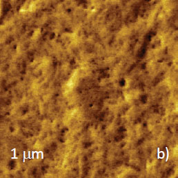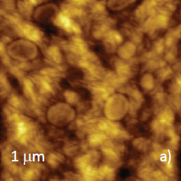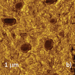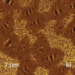 As mentioned above, there is variety of PE materials, and the examples of compositional imaging of PS/LLDPE and PS/HDPE blends are shown in Figures 6-7. Sub-micron surface structure of PS/LDPE is seen in height and phase images recorded in AM-PI mode, Figures 6a-b. Both images exhibit granular surface structures, and the phase contrast suggests that the bright domains are dissimilar with their surroundings.