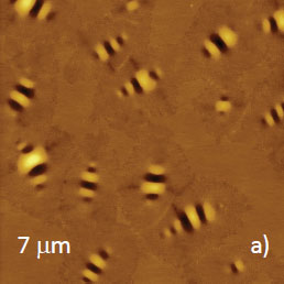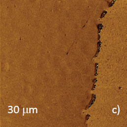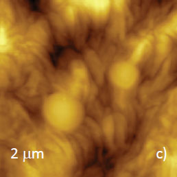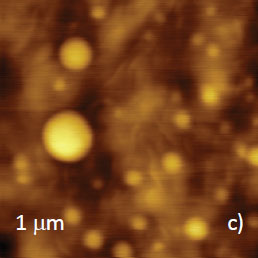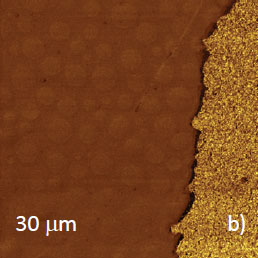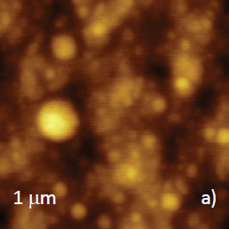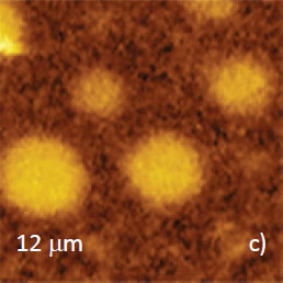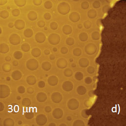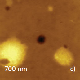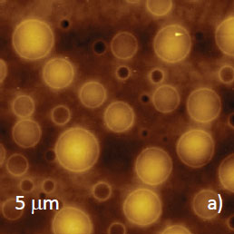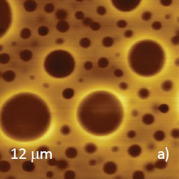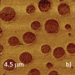 Microphase separation of the components in film of immiscible PS/PVAC blend leads to surface circular structures embedded in a relatively flat matrix. This morphology is seen on the left side of the height image in Figure 8a. A scratch on right side was made with a sharp wooden stick to open the glass substrate. By profiling the polymer/substrate step we determined that the film is ~80 nm thick. The domains, wich are few microns in diameter, are different in height, with most being raised up to 15 nm