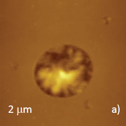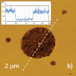 Surface locations, which are dominated by one of the components, were observed in film of PS/HDPE blend. In first case, a central sub-micron domain and three small nano-scale domains of HDPE are inserted into PS matrix, Figures 7a-b. This assignment is justified by the analysis of the elastic modulus map, which shows a softer nature of the domains. Lamellar structures, which are distinguished inside the central domain in the map, confirm this conclusion.