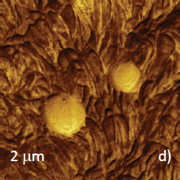 This is confirmed by HybriD ModeTM study (Figures 6c‑d), in which the probe exerts a stronger force and depresses soft surface structures. This made lamellar structures visible, particularly, in the elastic modulus map, Figure 6d. Therefore, the matrix is enriched in LLDPE. The circular domains, which are bright in the phase image, exhibithigher modulus and can be assigned to PS.