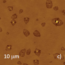 These extended shapes with lateral dimensions of several microns in length and vertical corrugations of up to 200 nm are shown in Figures 12a‑b. The “bees” are more common for surfaces of relatively thick adsorbates, and differently shaped structures are found in thin layers with thickness below 0.5 micron, Figures 12c-d.