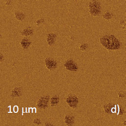 Figures 13a-d. Height image and dC/dZ maps in (a)-(b) and (c)-(d) were obtained, respectively, on thick and thin layer of bitumen