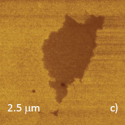 When this area was examined in AM‑PI mode, the phase image reveals a central domain, Figure 14b. This domain is much softer than its surrounding as seen from the elastic modulus map recorded in HybriD ModeTM, Figure 14c. Furthermore, the dC/dZ map, which was obtained in single-pass electric study, shows that this domain is enriched in asphaltene. This is the illustration of comprehensive compositional imaging of the heterogeneous bitumen sample in AFM.