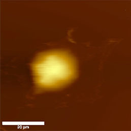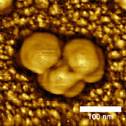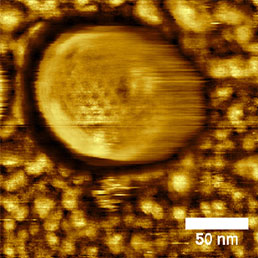 Size of the viruses predetermines them to be investigated mainly by electron microscopic methods. However, these methods rarely investigate the virus in its native form and often undesirable staining and dehydration of the sample is needed. The main advantage of atomic force microscopy in such samples is its ability to perform the scanning in liquid environment. In liquid, the pressure applied by the tip to the virus particles can be precisely controlled and often the structure of the sample surface can be directly visualized (see Fig.5)