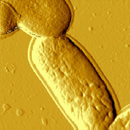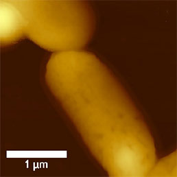 The size of bacteria is usually almost an order higher than the size of virus particles. The easiest way to visualize bacteria by AFM is scanning in air. Sample immobilization is as simple as to dry the suspension of bacteria onto a glass cover slip or mica surface. Using this method the bacteria are immobilized rmly enough to scan them even in contact mode, however, semi-contact mode is preferred where even the amplitude or phase can be recorded (see Fig.6).