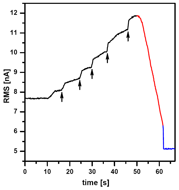 Fig.3, a typical response curve of the cantilever (RMS signal) can be seen during the process of approaching. At the beginning, the rising amplitude of the cantilever slows down the approaching speed (controller switches to ne approach mode) and that is why the approaching procedure needs to be several times restarted (marked with arrows). When the cantilever comes very close to the surface the amplitude starts to decrease. This mild decrease does not mean that there is a contact with the sample surface. At the end, there is a sudden drop in the amplitude, hitting the applied set point, which means that the tip reached contact with the sample. As well as the tuning, the landing procedure needs also some training and a good sense to set a proper set point and feedback gain.
