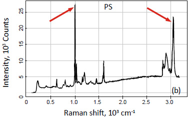 The compositional mapping of the morphology of thick PS-PVAC film has a particular benefit from the combined KPFM and Raman spectroscopy imaging as seen from Fig. 4. The surface depressions, which exhibit higher surface potential and brighter contrast in the Raman (PVAC) map, can be assigned to the polar constituent. Respectively, the elevated matrix is enriched in PS.