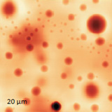 The height images reveal a phase-separated morphology with circular and elevated domains of the polar component immersed bright patches of these regions in surface potential, the strong dC/dZ contrast on these domains and their selective swelling in humid and methanol atmosphere [5].