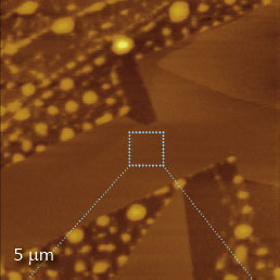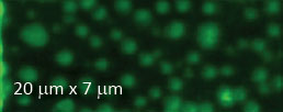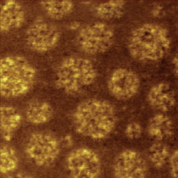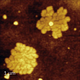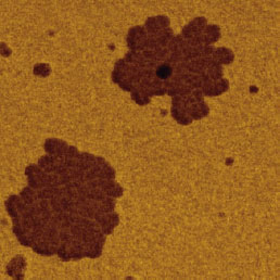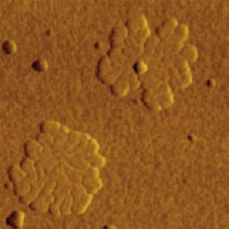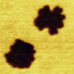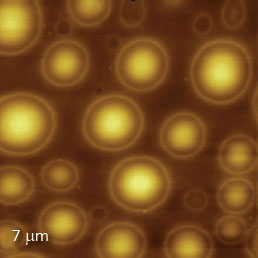 F14H20 adsorbates on silicon yield distinctive surface potential contrast, seen in the surface potential image shown to the right. The negative potential contrast is noticed only at the domains whereas small particles are not visualized in the surface potential image. The lack of small particles in the surface potential data is a strong indication that there is no noticeable crosstalk between the mechanical and electrostatic forces in the single pass operation. The same particles and F14H20 domains are seen in the dielectric response image; this is expected because any material between two electrodes will change the capacitance gradient.