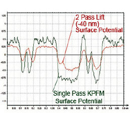 A comparison of the surface potential measurements made using the single pass KPFM-PM (where PM is the phase modulation by the electrostatic force gradient) and a double pass technique was performed with F14H20 assemblies on mica. First, we examined a sample location with single pass KPFM-PM, and then performed the double pass studies using positive (+40 nm) and negative heights (-30 nm, -40 nm) with respect to the average position of the probe. The surface potential difference between the F14H20 selfassemblies and nearby bare substrate regions was approximately -1.4 V in the KPFM-PM image and only around -0.8 V in the double-pass image with a lift of -40 nm. The comparison of the surface potential values obtained using single pass and double pass modes shows that the single-pass method is preferred for KPFM studies.