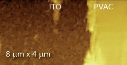 The multi-frequency measurements provide several ways of detecting the capacitance gradient changes which are related to the local dielectric properties. A comparison of topography and dC/dZ images of a PS-PVAC blend shows that the pattern of dielectric response is rather complex and by comparison differs from the binary contrast surface potential map of this blend shown above. In the development of quantitative dielectric measurements we explored the amplitude of cosθ at 2ωelec images of neat polystyrene and neat PVAC films on ITO glass. These measurements were performed under ambient conditions at the film edges shown on the right. The cosθ contrast obeyed the expected quadratic dependence on the stimulating voltage but the extraction of the dielectric permittivity (εr) data from these results is not trivial due to their complex relationship generally expressed as:
