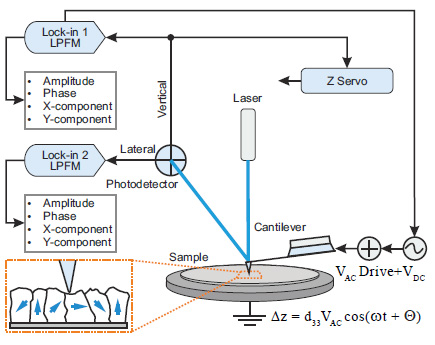 The changes of the sample dimensions are magnified by the cantilever deflection or bending and the latter are detected through the AC signals of different segments of the quadrant photodetector. The amplitude and phase of the vertical tip displacement are recorded by one of the lock-in amplifiers, and they are presented as VPFM amplitude and phase. Another amplifier is used for a detection of the amplitude and phase of the lateral response of the probe.