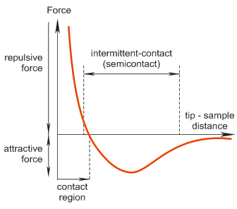 In [2] was demonstrated also possibility of materials sensing under abrupt decreasing of cantilever oscillation amplitude. Possibility of scanning sample surface not only in attractive but also in repulsive forces was demonstrated in [4]. Relatively small shift of oscillating frequency with sensing repulsive forces means that contact of cantilever tip with sample surface under oscillation is not constant. Only during small part of oscillating period the tip "feels" contact repulsive force. Especially it concerns to oscillations with relatively high amplitudes. Scanning sample surface with cantilever oscillated in this manner is not non-contact, but intermittent contact. Corresponding mode of Scanning Force Microscopy operation (Intermittent Contact mode or Semicontact mode) is in common practice.