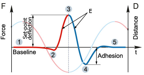 Main stages of the measurement cycle in the HD mode for the idealized displacements of the probe are shown in Fig. 2. At large distances between the probe and the sample, deflection of the cantilever remains constant, being at the base level (point 1 of the deflection profile); with further approach, the cantilever bends downward under effects of capillary adhesive forces (point 2). On further approach, when the repulsive tip-sample forces dominate, the bending reverses upwards until it reaches the set-point level (point 3) chosen for lateral scanning feedback. This is the turnaround Z-position of the cycle. As the sample and the tip depart, the probe might experience strong adhesive interactions reflected by a well (point 4) in the deflection, before the probe fully detaches from the sample and the cantilever restores its baselinedeflection (point 5).