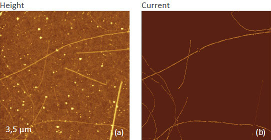 The map below shows that the current flows only through a select number of nanotubes and, most likely, these contrast changes point out that nanotubes exhibit conducting and semiconducting behavior.
