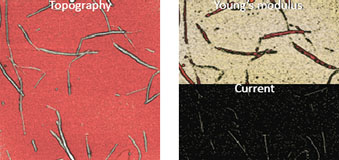 Electrical characterization of objects, that are weakly attached to the surface, has always been a challenge when using standard AFM modes like Conductive AFM. This was because often the tip moved or abraded the objects of interest. HybriD Mode drastically decreased the impact of lateral forces and simplified these experiments.Comparison of conductive and mechanical maps shown in this example allows the clear identification of single nanotubes and bundles.