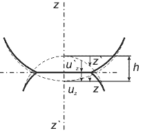 Fig. 2. Deformation two bodies. Surfaces before deformation are shown by dotted line, and squeezed surfaces – full line. The characters