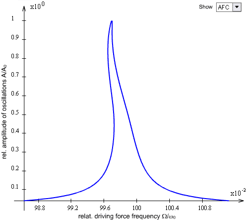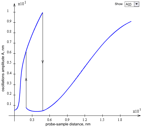 Let us study an oscillating cantilever behavior near a sample surface. Presented below is an interactive Flash model that allows to investigate changes in the character of resonance and approach-retraction curves depending on the driving force amplitude and probe-sample distance.