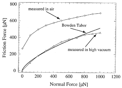 The Bowden-Tabor model is verified well in experiments. In Fig. 3 are shown experimental data [1] acquired in vacuum (lack of liquid film and capillary effect) and in air; theoretical curve (3) is presented for comparison.