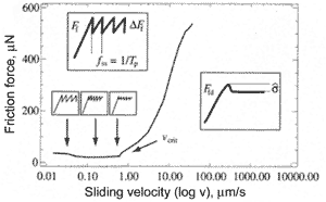 In microtribology, the phenomenon such as "stick-slip" motion is frequently observed. The frictional force between the two sliding surfaces is irregular and is of saw-tooth character (Fig. 4). If a hill of one surface is stuck to a "site" of the other surface via adhesion and capillary forces, it will hardly be unstuck without predominant force. Once it is separated, it jumps (slips) into another "site" where sticks for a while and so on.
