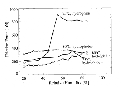 Fig. 6. Friction vs. humidity at various temperatures for hydrophilic and hydrophobic systems [1].