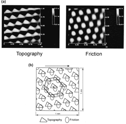 Fig. 8. (a) Topography and frictional force images for the HOPG sample sized 1 nm x 1 nm. (b) Schematic overlay of the two images.